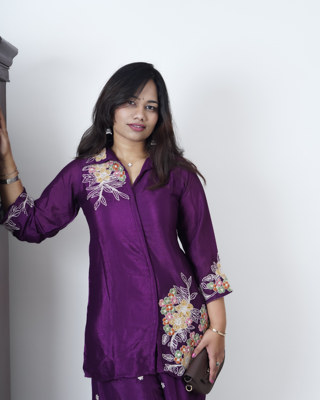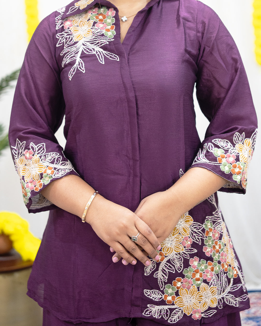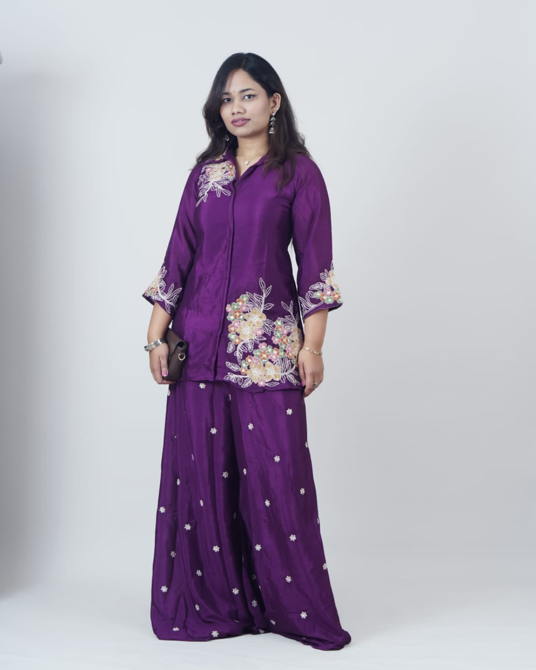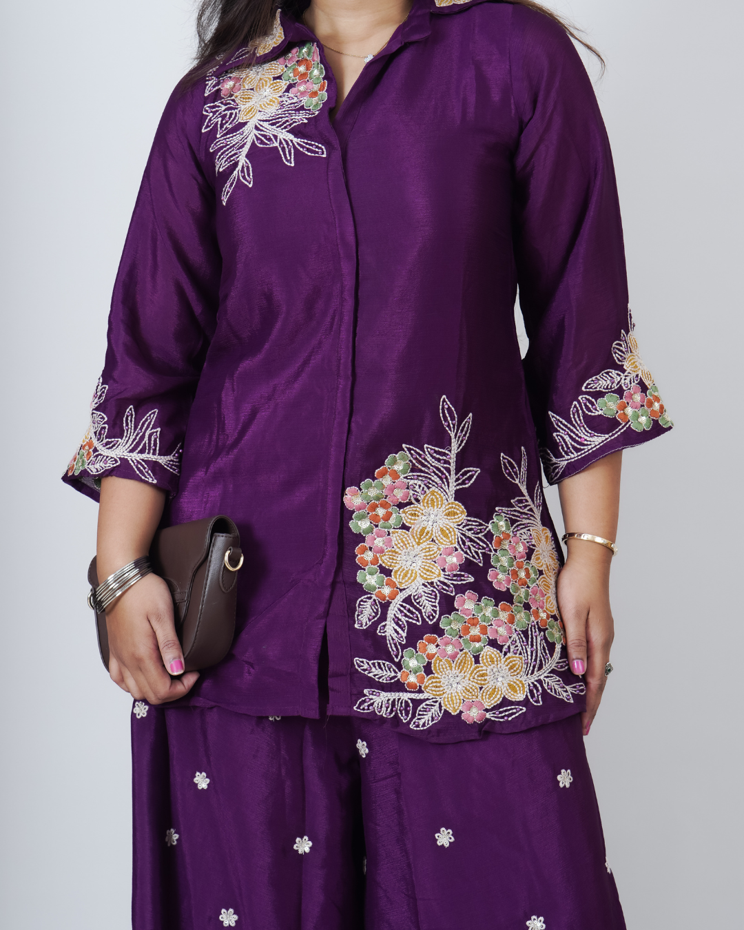A rich plum-purple 2-piece set crafted in a soft, lightweight fabric, beautifully highlighted with intricate multicolour floral embroidery. Featuring a collared embroidered top with elegant sleeve detailing and matching wide-leg pants, this set blends graceful tradition with modern comfort perfect for festive days and refined outings.